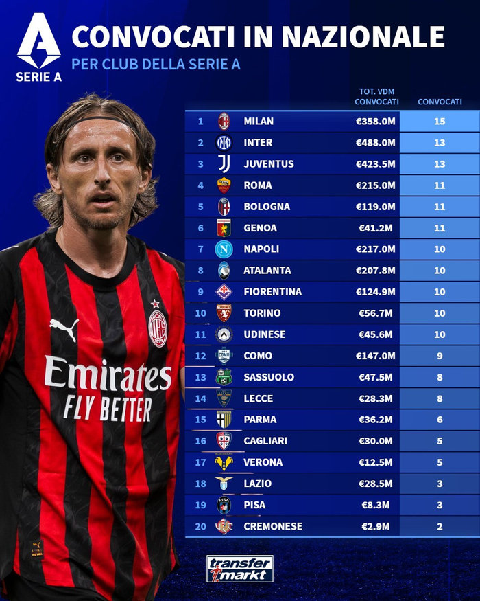 米兰俱乐部凭借15人被国家队征召,成为意甲赛场本次比赛日球员输出最多的球队。这不仅展现了俱乐部阵容的深度,也让米兰在国际舞台上有更多存在感。